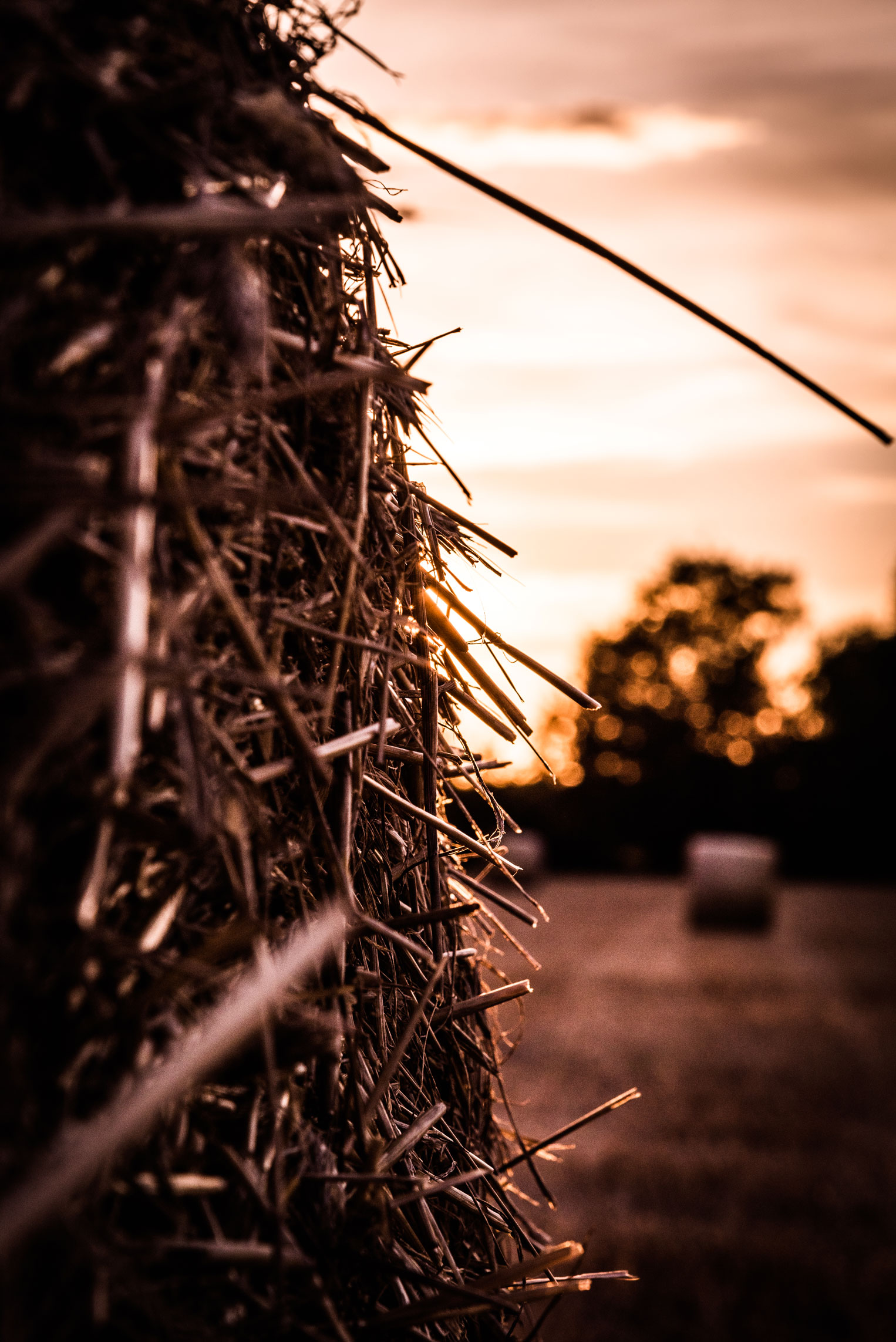 Es war eine wundervolle Ruhe an diesem Abend, es war so wunderschönes Licht! Ich fotografierte ein bisschen, suchte nach interessanten Perspektiven, um die Strohballen in die Bilder einzubringen. Irgendwann, als die Sonne schon sehr tief stand, setze ich mich einfach auf’s Feld zwischen die Ballen, legte die Kamera in den Schoß, atmete tief ein und genoss einfach diesen Moment. Diese Ruhe, diese Weite des Feldes, diese friedliche Stimmung. Die Natur, die zur Ruhe gekommen ist, die Sonne, die immer tiefer gesunken war, der Himmel, der starke Wolken zum Besten gab, die mit dem Sonnenlicht ein wunderschönes Bild ergaben.